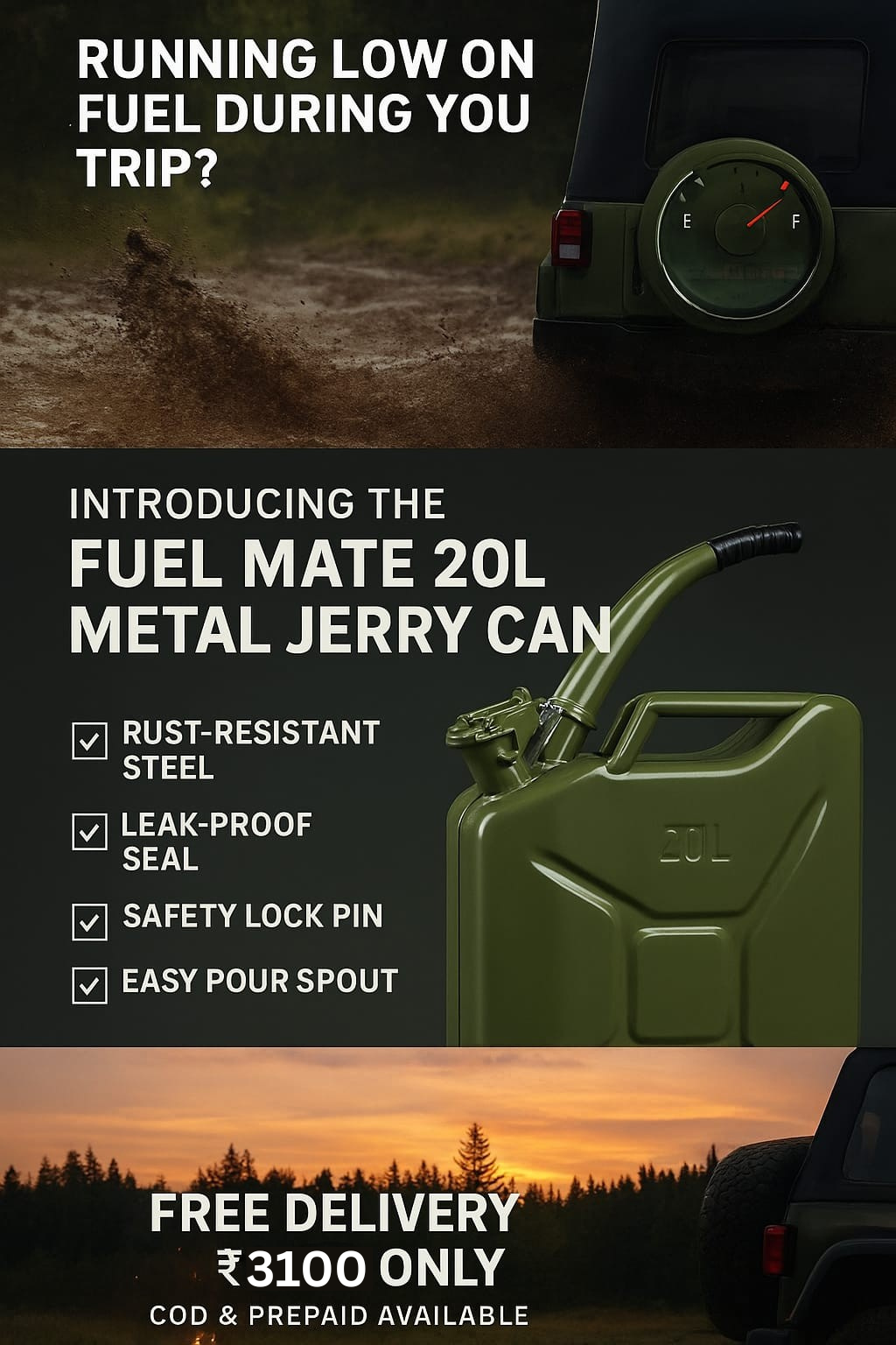 Heavy Duty Jerry Can (20L): Designed for secure fuel or water storage with a leak-proof cap and corrosion-resistant coating.
